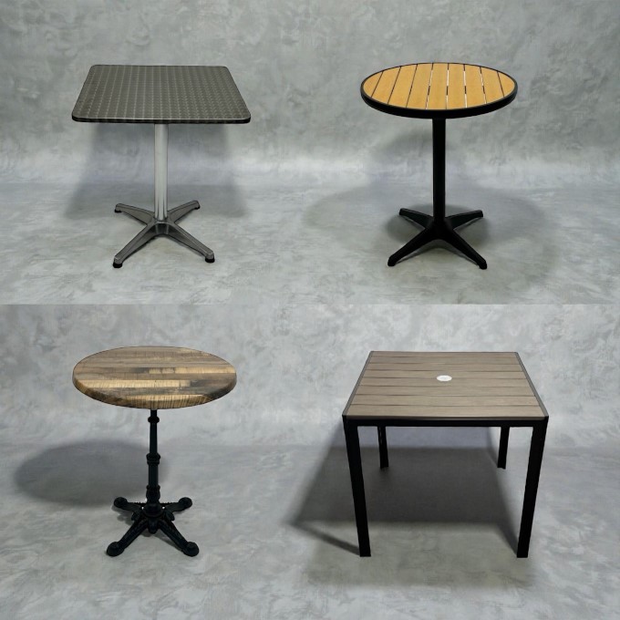Our cafe & bistro tables have a range of finishes from aluminium, glass, plastic and wood. We stock stacking tables and also flip down tables to save space when the tables are not in use.