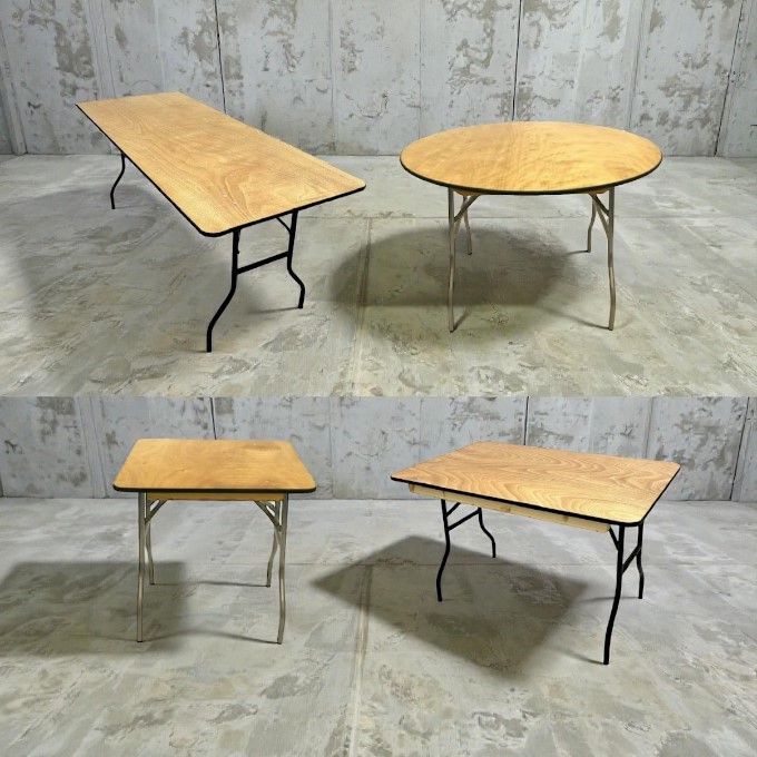 Our range of varnished wooden trestle tables and round tables have strong metal legs that neatly fold away when not in use. The varnished wooden tops makes these tables easy to wipe clean.