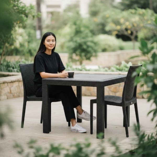 New for 2026, our Black Wicker Garden Furniture Set comprising of one 80cm square table and two of the black rattan chairs.