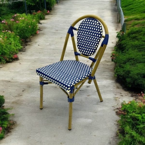 These Brand New Blue Paris Bistro Chairs are crafted for longevity and comfort. These chairs exhibit a timeless appeal that blends seamlessly into various décor styles. The exceptional design and robust structure make them a brilliant addition to indoor and outdoor settings. Each chair has a gold steel frame with a bamboo effect finish with blue and cream rattan seat and back. With a lightweight, stackable construction, these chairs allow you to create an affordable way of seating 100’s of guests yet when not in use they stack neatly and take up very little space.